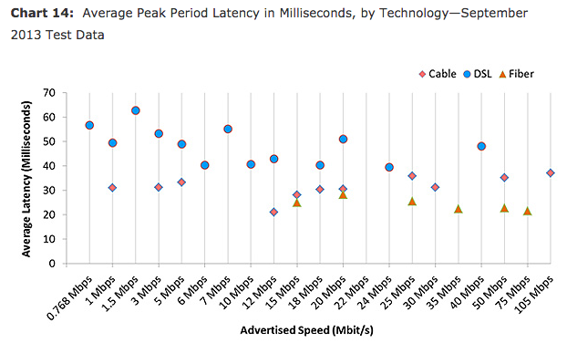 Fiber-to-the-home services provided 24 ms round-trip latency on average, while cable-based services averaged 32 ms, and DSL-based services averaged 49 ms.
