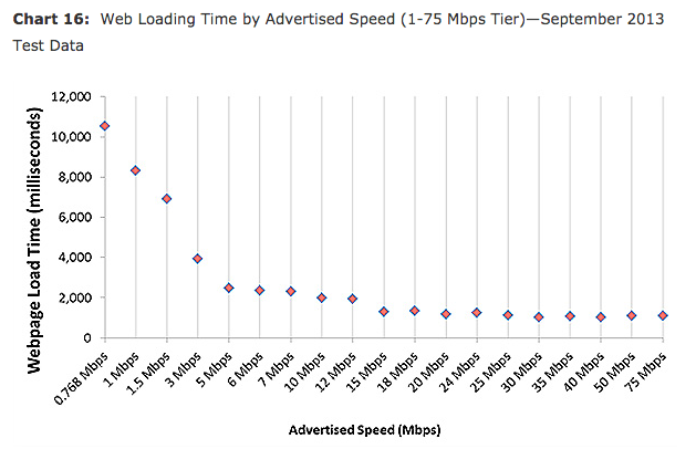In web performance circles you’ll often hear about how the latency of a connection can be a bigger issue than bandwidth. The FCC broadband measurement report has a graph that illustrates this nicely: