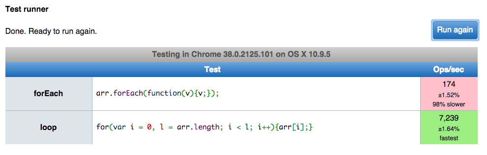 I ran across a jsperf.com test of a for loop vs foreach and I was surprised at the difference when running the test in Chrome 38: