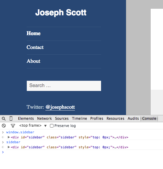 On josephscott.org the sidebar section has an ID of “sidebar”, which is easily accessed in the Chrome Console:
