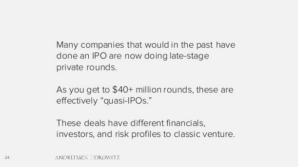 Slide 24 from U.S. Tech Funding — What’s Going On? | Andreessen Horowitz mentions something I’ve seen brought up previously: