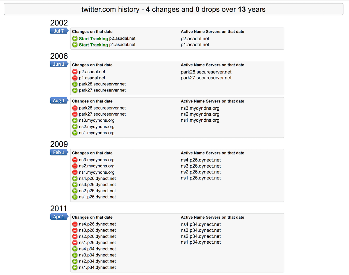 We track nameserver changes since 2002 for all COM, NET, ORG, INFO, BIZ and US domains.
