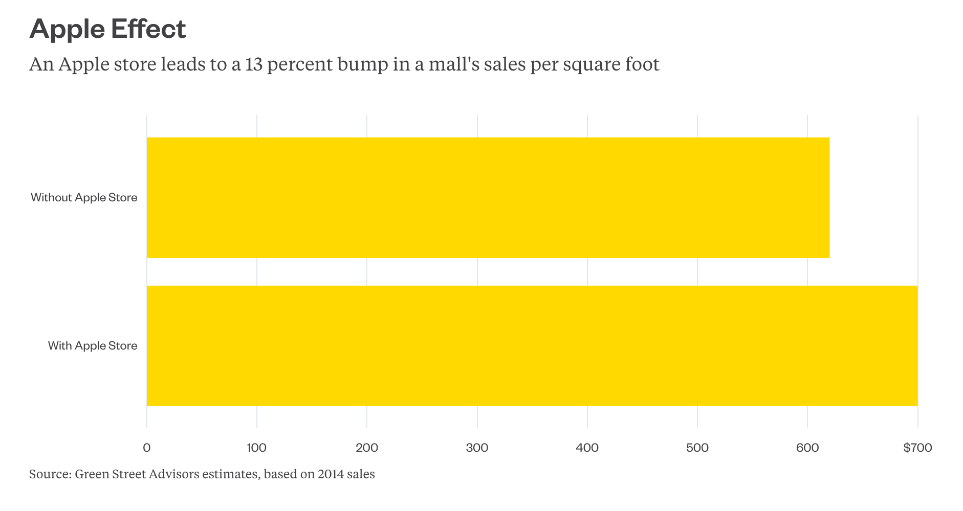 Last month a Bloomberg article on malls ( These Malls Didn’t Get the Memo They’re Dying ) included data estimates from Green Street Advisors on how “An Apple store leads to a 13 percent bump in a mall’s sales per square foot”: