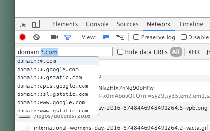 Yesterday I needed to look for particular host names. Fortunately the filter field supports this with domain:. But it does one better than that. If you type just domain: it will give you a list of host names used in requests for that page, along with wildcard options.