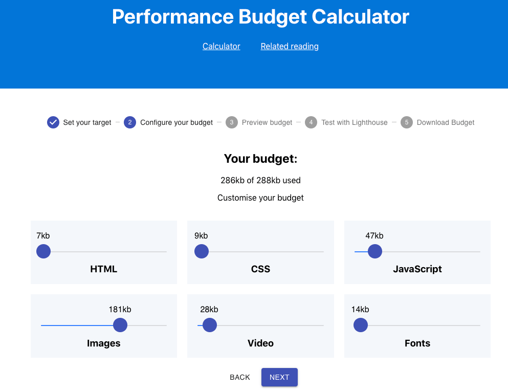 For those of you looking to get started with performance budgets, try out performancebudget.io. It is a quick way to play with numbers: