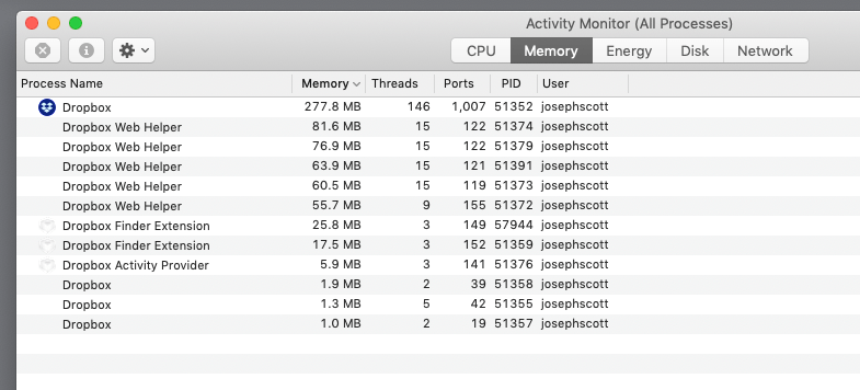 To be very clear, this is on MacOS 10.14.6 and Dropbox 86.3.141. That combination ends up going through more than 650 MB of memory. All I want to do is reliably sync files, and that feels like too much memory for that one job.