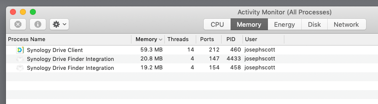 As a comparison, I tried out Synology Drive, which has a MacOS client for syncing files with a Synology NAS. I was surprised at the difference in memory usage: