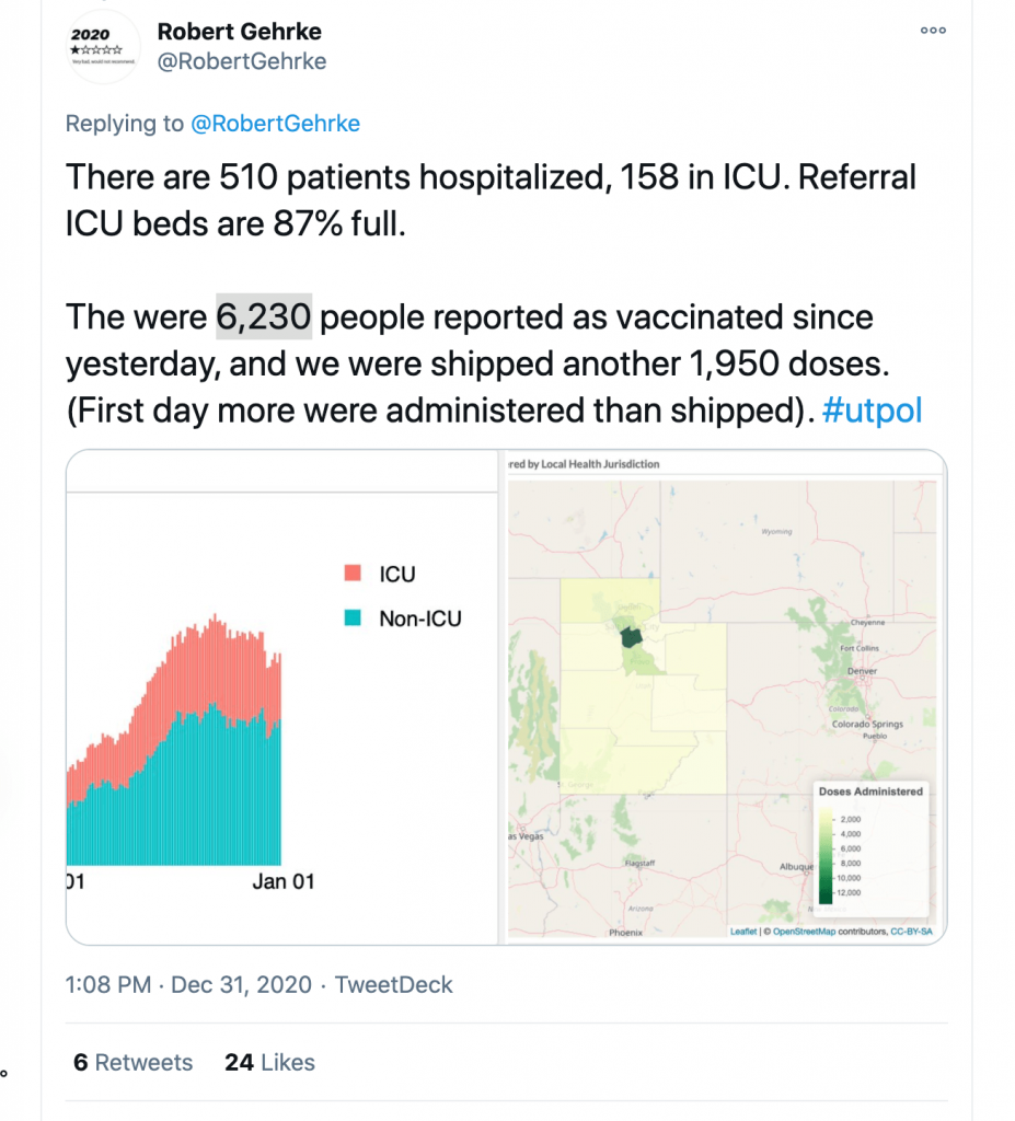 Thank you, this is worthwhile bringing to everyone’s attention (and comports with my own calculations.) Given that every infection could result in death, 1 in every 200 known Utah infections have died so far, and we’re experiencing over 2,000 known new cases per day, we are likely to see hundreds more Covid deaths. The vaccination part of preventing these deaths couldn’t be more important. I’m with those demanding all deliberate speed including 24/7 administration of the shots. Gov-elect Cox and Director Saunders must see that it happens. Any delay whatever is unconscionable.