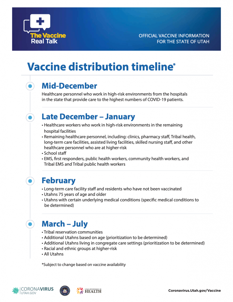 The stated goal for a vaccination timeline in Utah is having it available to “All Utahns” some where between March and July 2021.