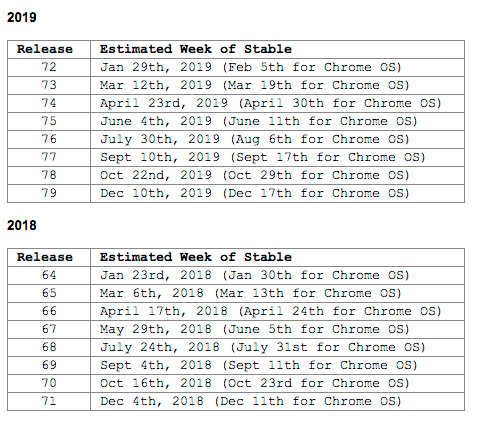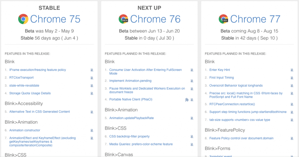 This is great if the main thing you are looking for is the “when” of Chrome releases. For example, Chrome 76 is supposed to get the “stable” release today, 30 July 2019.