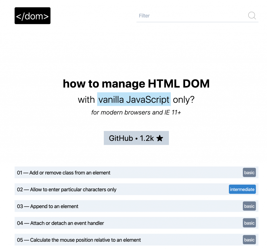 The htmldom.dev examples are focused IE 11 and modern browsers. Each example is rated basic, intermediate, or advanced. I wouldn’t worry about that too much though, even the advanced ones that I looked at came with plenty of explanatory text, making it a helpful resource for those at all levels of JavaScript experience.