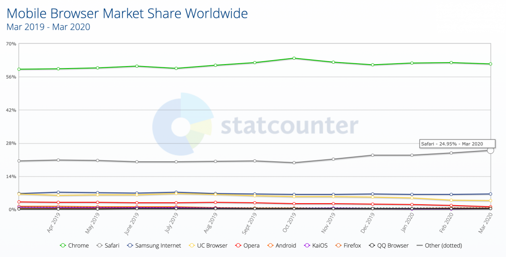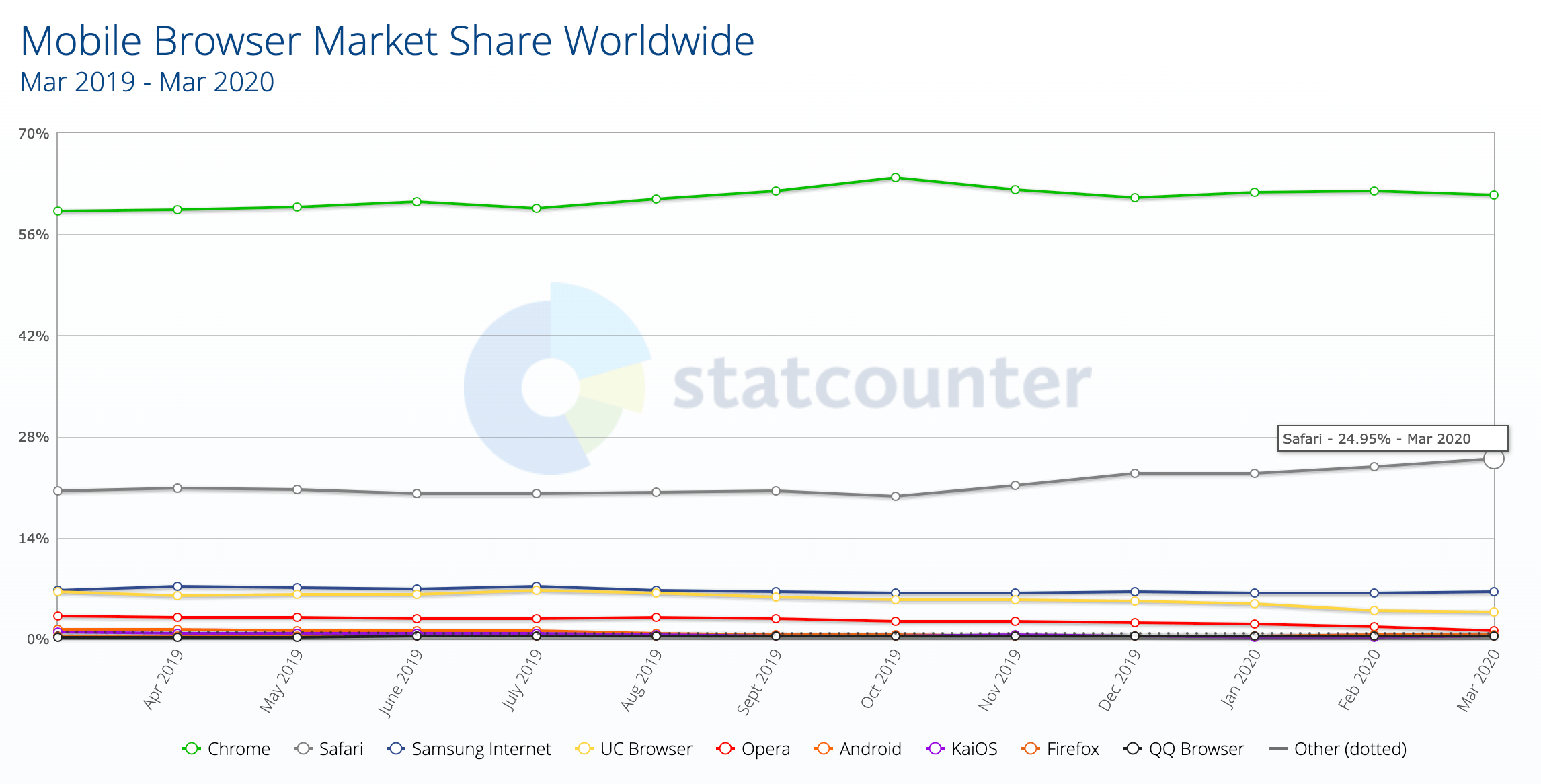Now some may respond with: so what, Chrome is the most popular browser in use today. And they would be right. What they would be missing is that Safari has a nearly 25% share of the browser market on mobile devices: