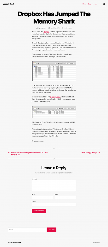 With the year 2020 fast approaching, I thought it would be a good time to change up the style on blog.josephscott.org. To that end, I’m trying out the Twenty Twenty WordPress theme.